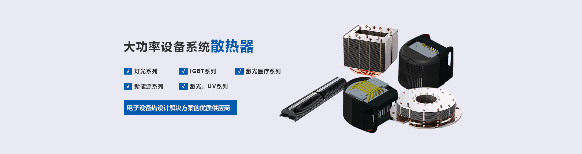 是具有電子設(shè)備熱設(shè)計解決方案的優(yōu)質(zhì)供應(yīng)商。主要產(chǎn)品有銅材、鋁材、銅鋁復(fù)合散熱器、熱管散熱器、水冷散熱器等。產(chǎn)品用于LED、舞臺燈光、大型服務(wù)器、光伏、風(fēng)能、變頻器、軌道交通、新能源汽車、儀器設(shè)備等